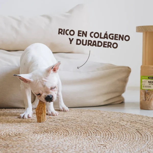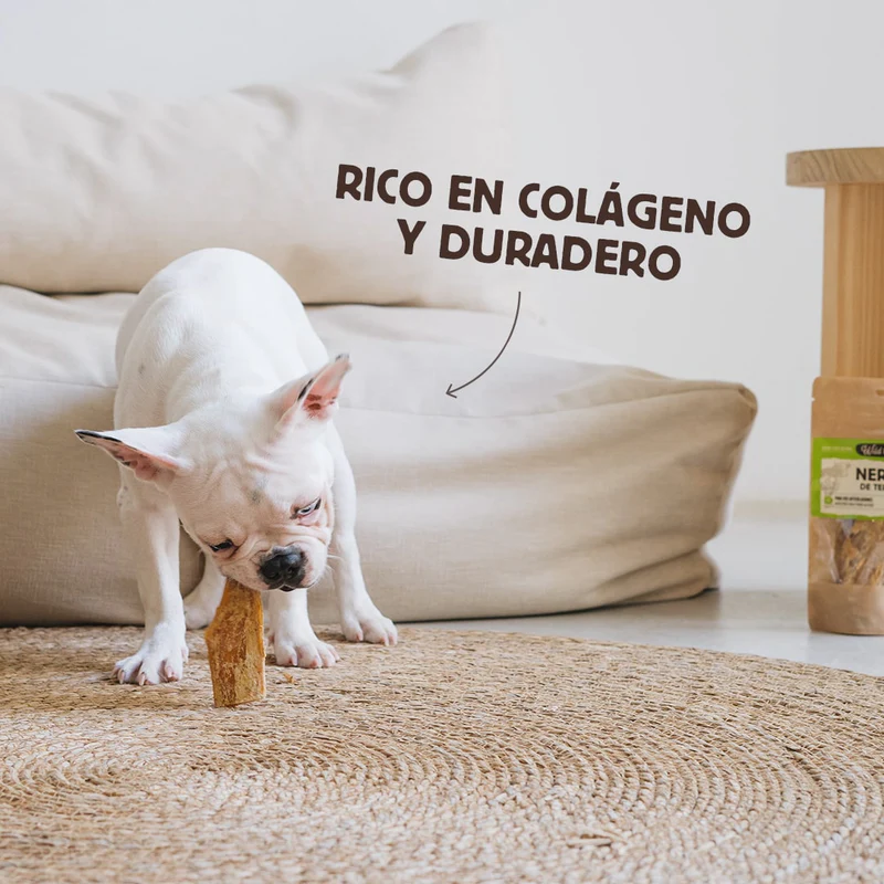 El nervio de ternera es un snack rico en proteínas, bajo en grasa y en carbohidratos, por lo que es el tentempié perfecto para picar entre horas. Su consistencia refuerza la mandíbula y la musculatura y lo hace más resistente para entretenerse durante más tiempo.